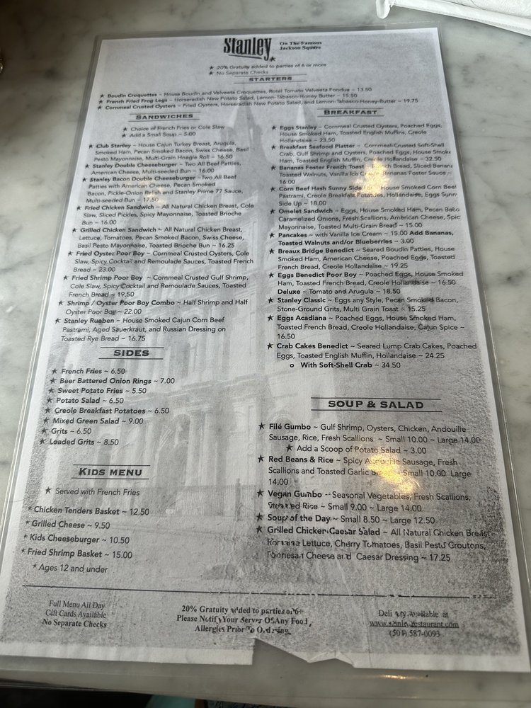 Located in New Orleans, Stanley offers a delightful menu of Breakfast & Brunch options. From the mouthwatering Bananas Foster French Toast to the savory Breaux Bridge Benedict, every dish is a culinary masterpiece. The Corned Beef Hash and Eggs Benedict are also highly recommended. For salads & soups, don't miss the Chicken and Alligator Sausage Gumbo or the Hearts of Romaine Salad. The sandwiches at Stanley are a must-try, especially the Club Stanley and the Oyster Poor Boy. With options for vegan and limited vegetarian diets, Stanley caters to all tastes. The cozy atmosphere, outdoor seating, and friendly staff make dining here a truly enjoyable experience. Make sure to stop by Stanley for a delicious meal that will leave you coming back for more.